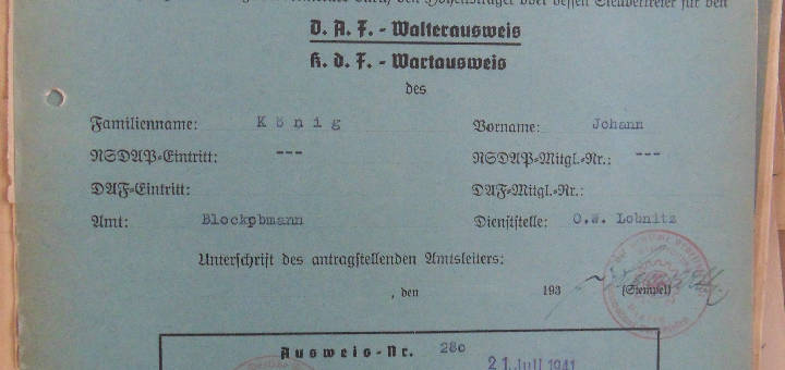 W aktach personalnych odnaleźć można także ausweisy, czyli rodzaj legitymacji wydawanej przez zakłady pracownikom oraz członkom ich rodzin. Oprócz fotografii znajdziemy w niej imię, nazwisko, datę i miejsce urodzenia oraz dokładne miejsce zamieszkania. Z tyłu z kolei znajduje się numer dokumenty i dane przełożonego w DAF-ie. Dla Aloisa Sz. zachowała się nawet legitymacja członkowska.