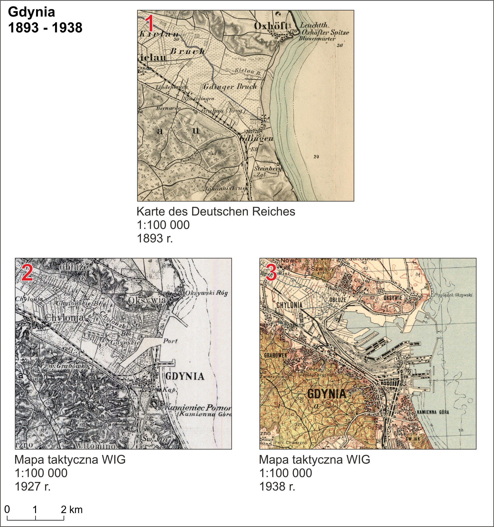 Gdynia, o której pierwsza wzmianka pochodzi z XIII wieku, aż do lat dwudziestych XX wieku była niewielką wioską nikłym znaczeniu. Na dowód tego wystarczy spojrzeć na mapę nr 1 z końca XIX wieku. Zgodnie z kluczem znaków niemieckiej mapy „Karte des Deutschen Reiches, Gdingen”, czyli dzisiejsza Gdynia była „wioską od 20 do 100 m[ieszkańców], natomiast „Oxhöft”, czyli Oksywie, jej późniejsza dzielnica „wsią pon[iżej] 400 m[ieszkańców]. Ani jedna, ani druga osada nie dysponowała wówczas portem, przynajmniej takim, który byłyby wart zaznaczenia na mapie. Stan „przejściowy” między Gdynią-wioską a Gdynią-miastem, pokazuje mapa nr 2 opracowana przez kartografów WIG. Po I wojnie światowej, właśnie Gdynię Eugeniusz Kwiatkowski wybrał na miejsce wybudowania w Polsce pełnomorskiego portu. Już w 1923 roku miało miejsce otwarcie tymczasowego nabrzeża (widać je na mapie), a sama osada od 1927 roku zyskała prawa miejskie. Status administracyjny osadnictwa bardzo łatwo odczytuje się z mapy. Istnieje bowiem w kartografii zasada opisywania miast „WERSALIKIEM” a wsi „tekstem”. Ostatnie ujęcie, na mapie nr 3 prezentuje nam Gdynię w pełnej krasie z 1938 roku. Poza rozbudową instalacji portowych, warto zwrócić uwagę także na „wchłanianie” otaczających miasto wsi, które stały się jego dzielnicami – Oksywie, Chylonia, Kamienna Góra czy Św. Jan.