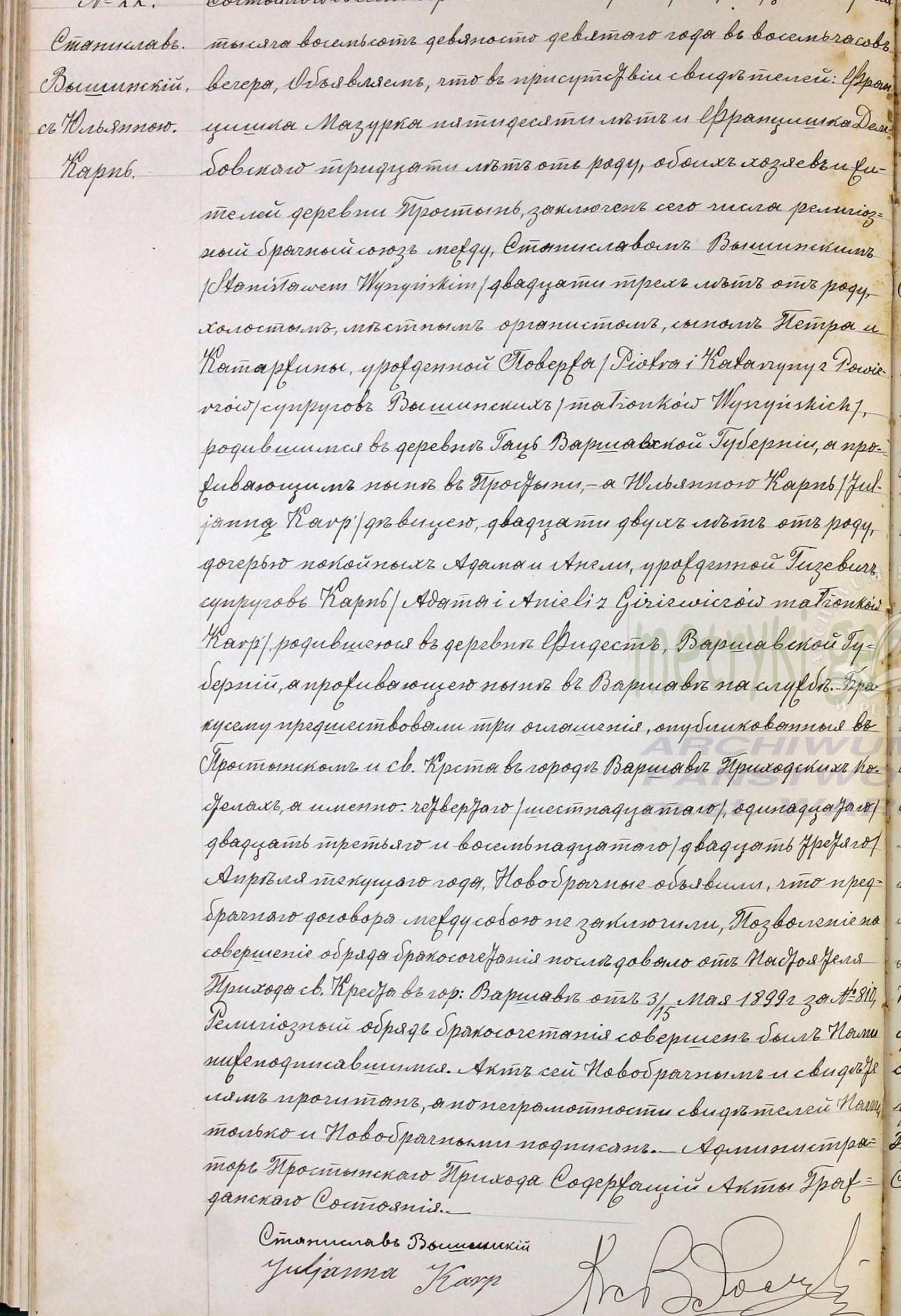 Tam 4 maja 1899 roku 23-letni kawaler, miejscowy organista, syn Piotra i Katarzyny z Powierzów, urodzony we wsi Gac warszawskiej guberni, a zamieszkały w Prostyniu – Stanisław Wyszyński, ożenił się z matką Prymasa Tysiąclecia – Julianną z Karpów.