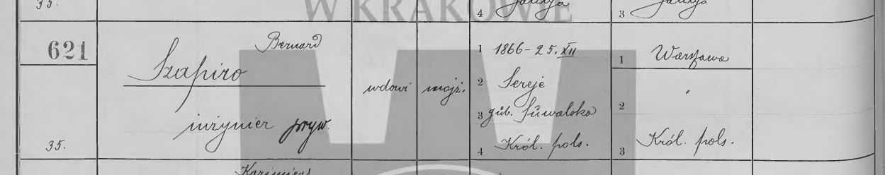Jednak siedem lat wcześniej, w roku 1910, przeprowadzono w Krakowie spis ludności. Pod numerem 621 zapisano został ojciec Hanki Sawickiej – Bernard Szapiro. Zapisano przy nim, że jest wdowcem oraz prywatnym inżynierem. Co ciekawe, nie znalazłem nigdzie informacji, by Szapiro miał wcześniej inną żonę, niż Marię – matkę Sawickiej. Według bardzo wielu portali, książek i innych dokumentów, Bernard Szapiro urodził się 25 grudnia 1866 r. we Lwowie. Według bazy dr. Marka Minakowskiego ojciec Hanki Sawickiej przyszedł na świat w Warszawie.