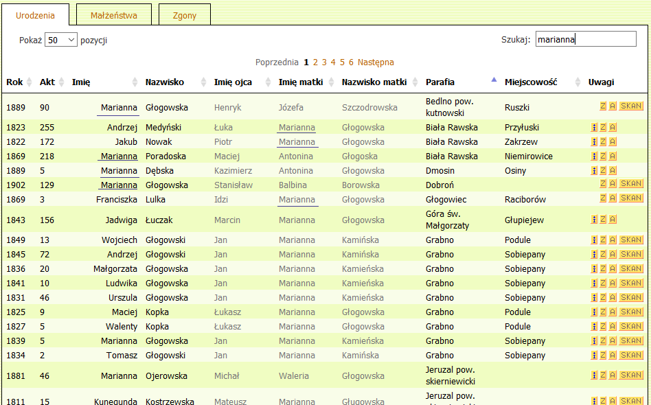 4) Bardzo istotną funkcjonalnością nowej Geneteki jest “wyszukiwarka w wyszukiwarce”. Po wpisaniu nazwiska i wyświetleniu rekordów, po prawej stronie u góry, zobaczymy okienko z napisem “szukaj”. Możemy w nim wpisać imię albo nazwisko. Np. wpisując Marianna Geneteka pokaże nam wyłącznie rekordy, w których pojawia się imię Marianna i wcześniej wpisane nazwisko: