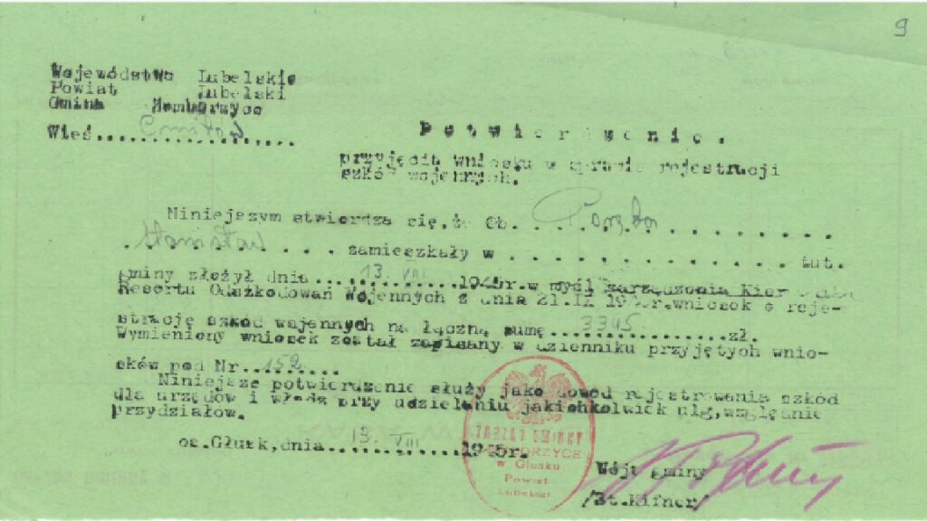 Starostwo Powiatowe Lubelskie w piśmie z 12 kwietnia 1945 roku skierowanym do podległych sobie wójtów gmin, przypominało np., że rejestrację szkód wojennych powinno prowadzić się przestrzegając podziału na szkody poniesione przez ludność cywilną i samorządy. Zwrócono również uwagę na szczególną dbałość o odpowiednie opisanie strat moralnych wywołanych znęcaniem się okupanta niemieckiego z przyczyn narodowościowych, rasowych lub wyznaniowych, wywiezieniem do obozu lub na roboty.