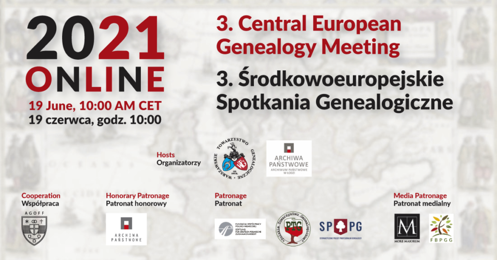19 czerwca 2021 roku odbędą się trzecie już Środkowoeuropejskie Spotkania Genealogiczne. Tym razem, z uwagi na sytuację pandemiczną, konferencja dostępna będzie wyłącznie formule online. Na uczestników – całkowicie bezpłatnie – czekają bardzo ciekawe wykłady!