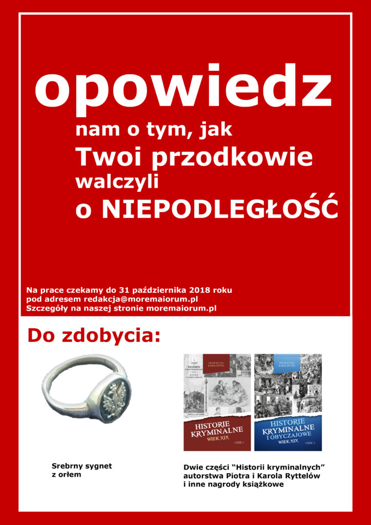 4. Pośród autorów najciekawszych opowieści zostaną wybrane osoby, które otrzymają: srebrny sygnet z orłem, dwie części „Historii kryminalnych” autorstwa Karola Ryttela i redaktora „More Maiorum” Piotra Ryttela, rozdamy także inne nagrody książkowe,