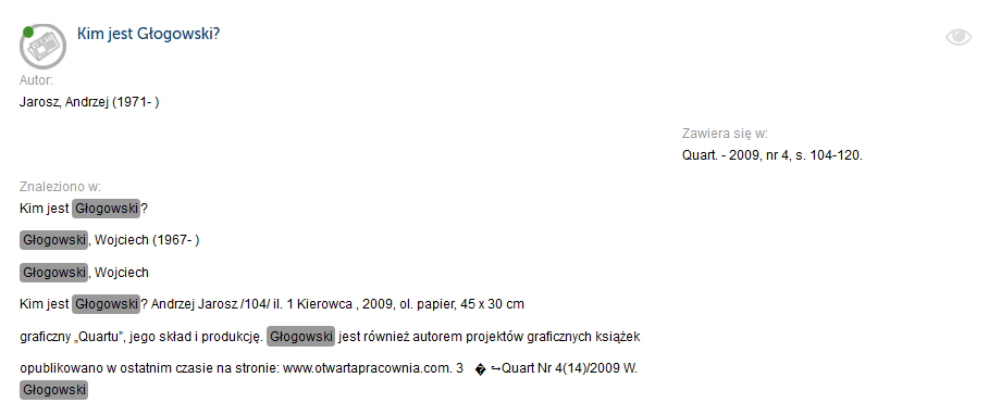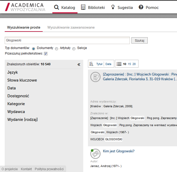 Oznacza to, że wpisane słowo nie będzie wyszukiwane wyłącznie w słowach kluczowych (autor, tytuł, opis publikacji), ale przede wszystkim w warstwie tekstowej. Oczywiście ta musi być załączona – pamiętajmy, że wiele materiałów dostępnych jest wyłącznie w formie graficznej.