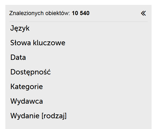 Zanim przejdziemy do przeglądania konkretnej publikacji, możemy zawęzić wyniki wyszukiwania poprzez wykorzystanie możliwości, jakie daje nam menu po lewej stronie. Możemy wybrać kolejno: język publikacji, słowa kluczowe (np. Warszawa, architektura), datę (konkretny rok), dostępność (czy materiały są typu open-source, czy chronione prawami autorskimi), kategorię (np. czasopisma) oraz wydawcę: