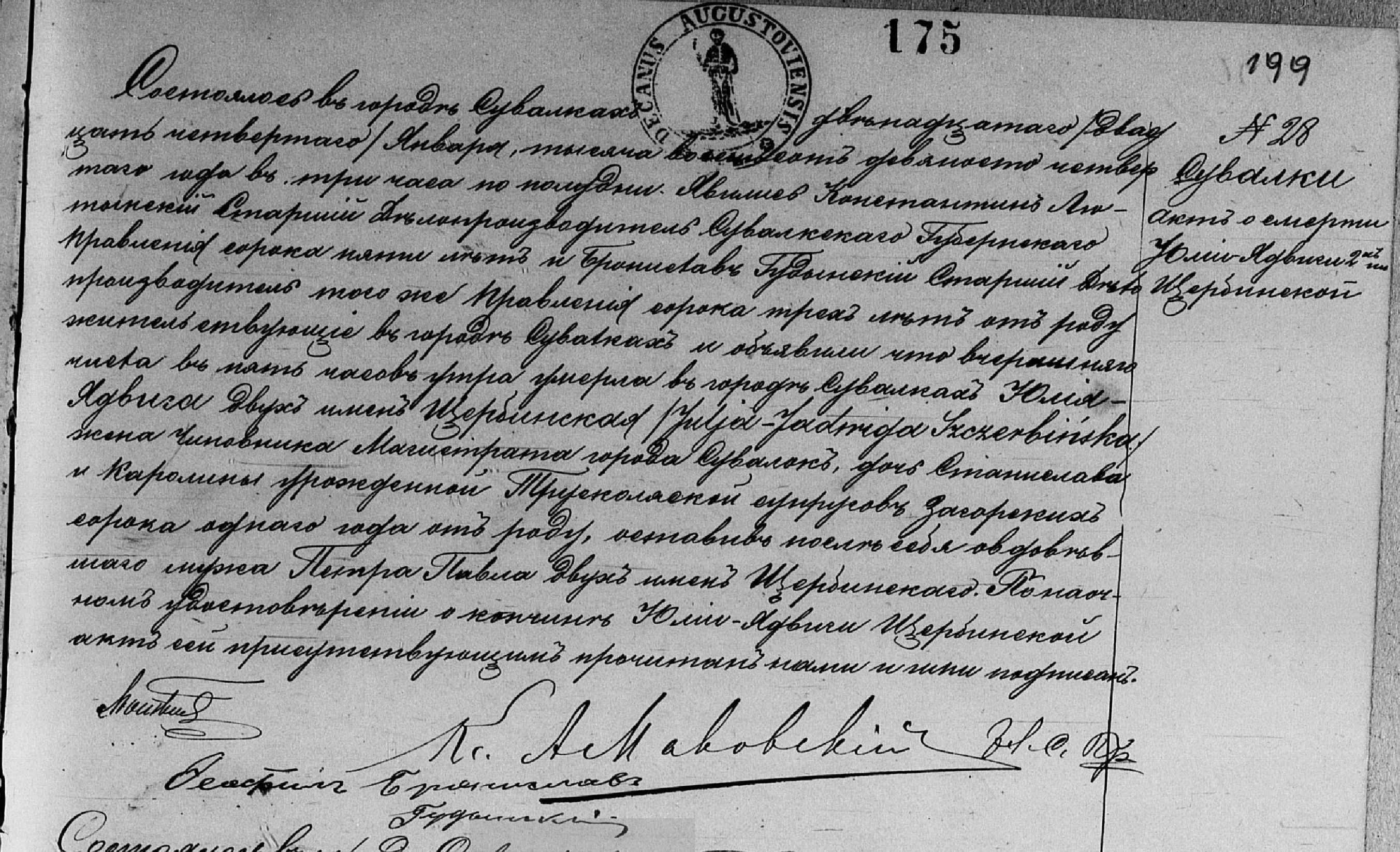 Piotr Paweł Szczerbiński zmarł dwa lata, dwa miesiące i dwa dni po swojej małżonce. Stało się to 13/25 marca 1896 r. w Suwałkach, gdzie zmarły był urzędnikiem miejskiego magistratu. Według powyższej metryki, w chwili śmierci był 49-letnim wdowcem, synem Michała i Anny z Dormejków małżonków Szczerbińskich.