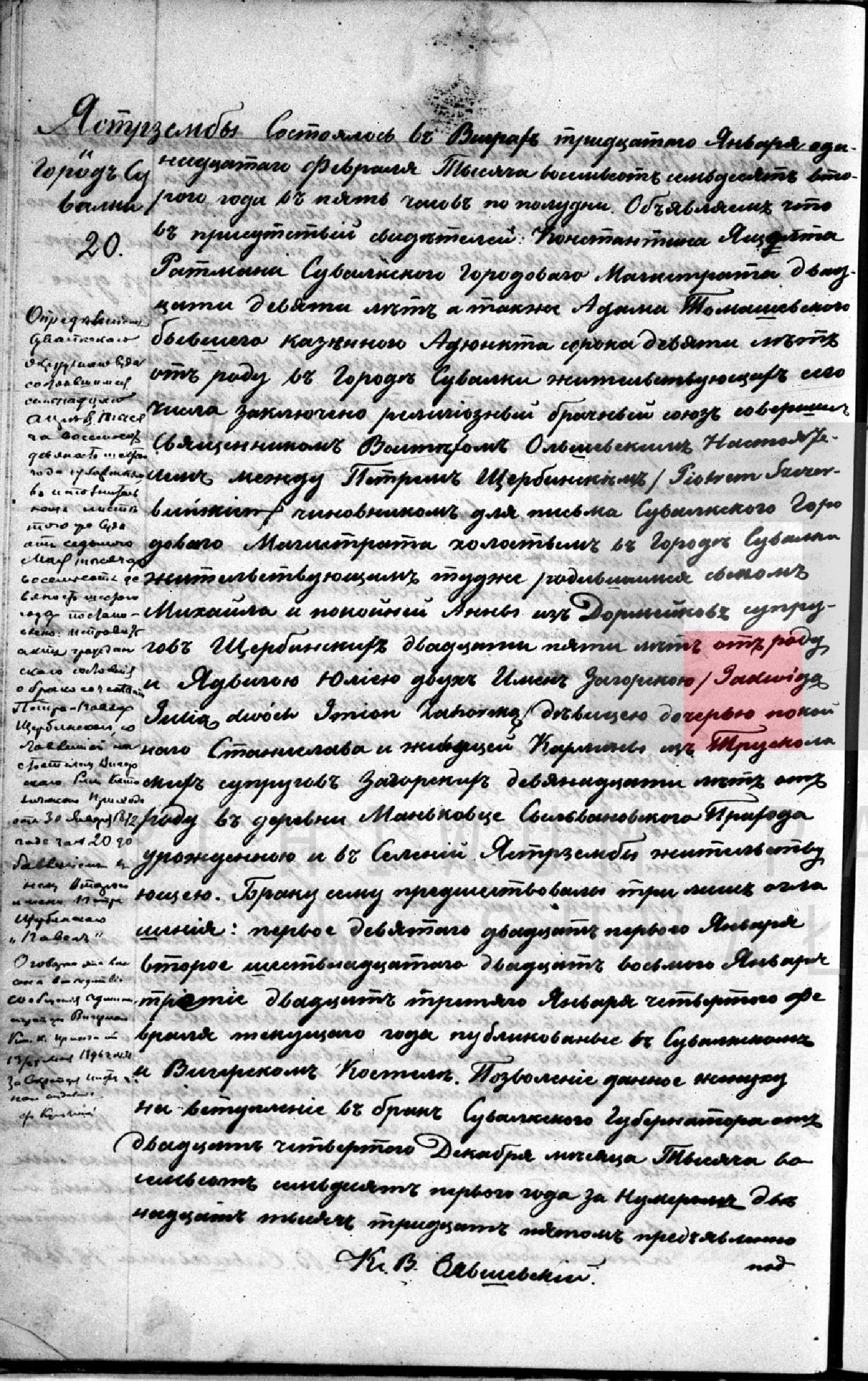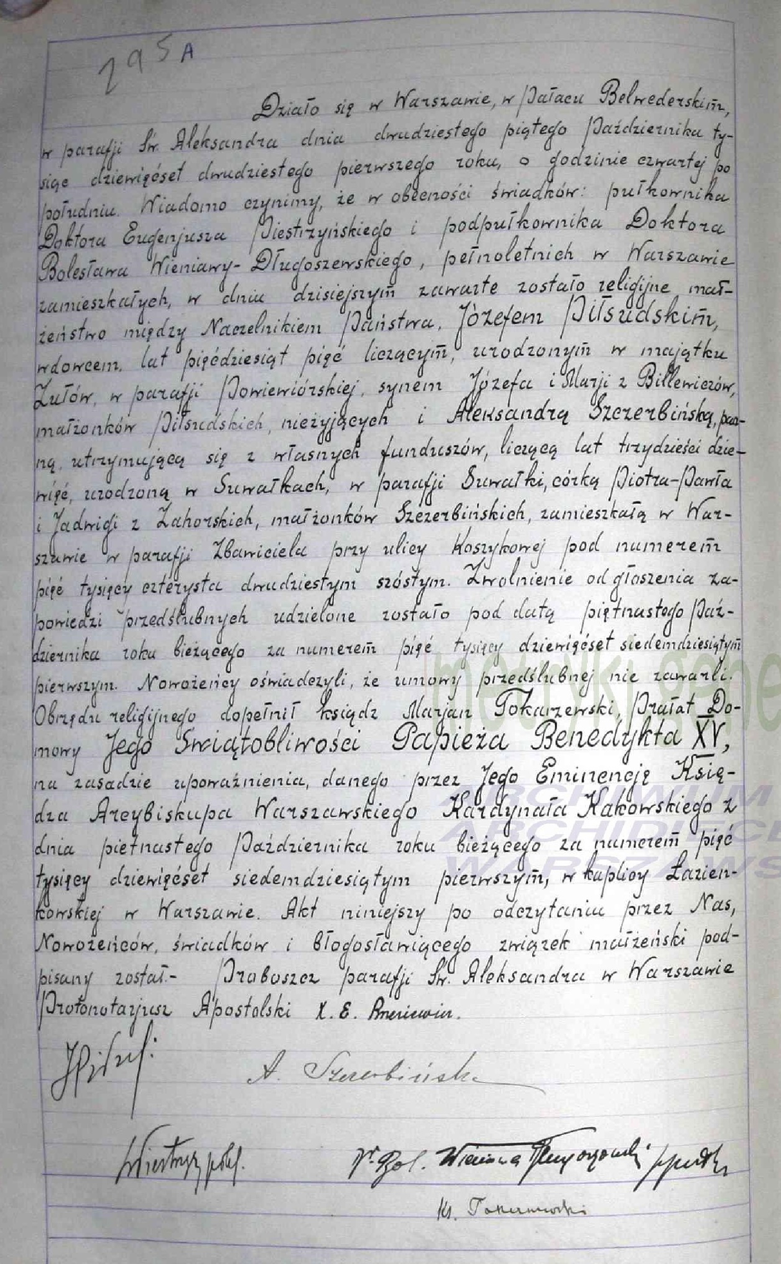 25 października 1921 r. o godz. 16 w Warszawie w Pałacu Belwederskim, zawarte zostało religijne małżeństwo pomiędzy Józefem Piłsudskim – 55-letnim wdowcem, urodzonym w Zułowie w parafii powiewórskiej, synem nieżyjących już Józefa i Marii z Billewiczów małżonków Piłsudskich, a 39-letnią Aleksandrą Szczerbińską – panną, urodzoną w Suwałkach, córką Piotra Pawła i Jadwigi z Zahorskich małżonków Szczerbińskich. Świadkami zawarcia tego związku małżeńskiego byli Eugeniusz Piestrzyński – pułkownik doktor, i Bolesław Wieniawa-Długoszewski – podpułkownik doktor.