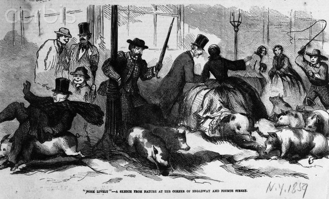 To, co widzą Państwo powyżej, to bynajmniej nie karykatura czy też satyra na rzeczywistości, ale autentyczna scenka rodzajowa. Oto stadko świń tratuje przechodniów na rogu Broadway’u i Czwartej alei.