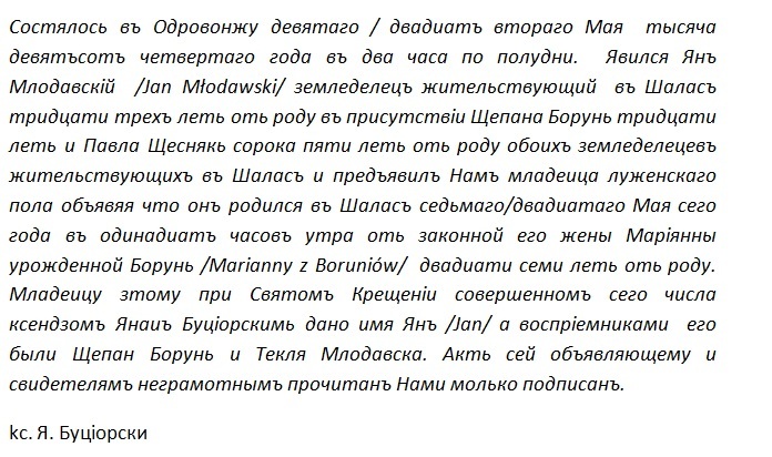 Działo się w Odrowążu dnia 9/22 maja tysiąc dziewięćset czwartego roku o godzinie drugiej po południu. Stawił się Jan Młodawski, rolnik zamieszkały w Szałasie, lat 33 w obecności Szczepana Borunia, lat 30 i Pawła Szcześniaka, lat 45, obaj rol-nicy zamieszkali w Szałasie i okazali Nam dziecię płci męskiej, mówiąc, że urodził się on w Szałasie siódmego/dwudziestego maja roku bieżącego o godzinie jedenastej rano z prawnej jego małżonki Marianny z Boruniów, lat 27. Dziecięciu temu na chrzcie świętym dzisiaj odbytym przez Jana Buciorskiego nada-no imię Jan, a rodzicami jego chrzestnymi byli Szczepan Boruń i Tekla Młodawska. Akt ten stawiającemu i świadkom niepiśmiennym przeczytany i przez Nas podpisany.
