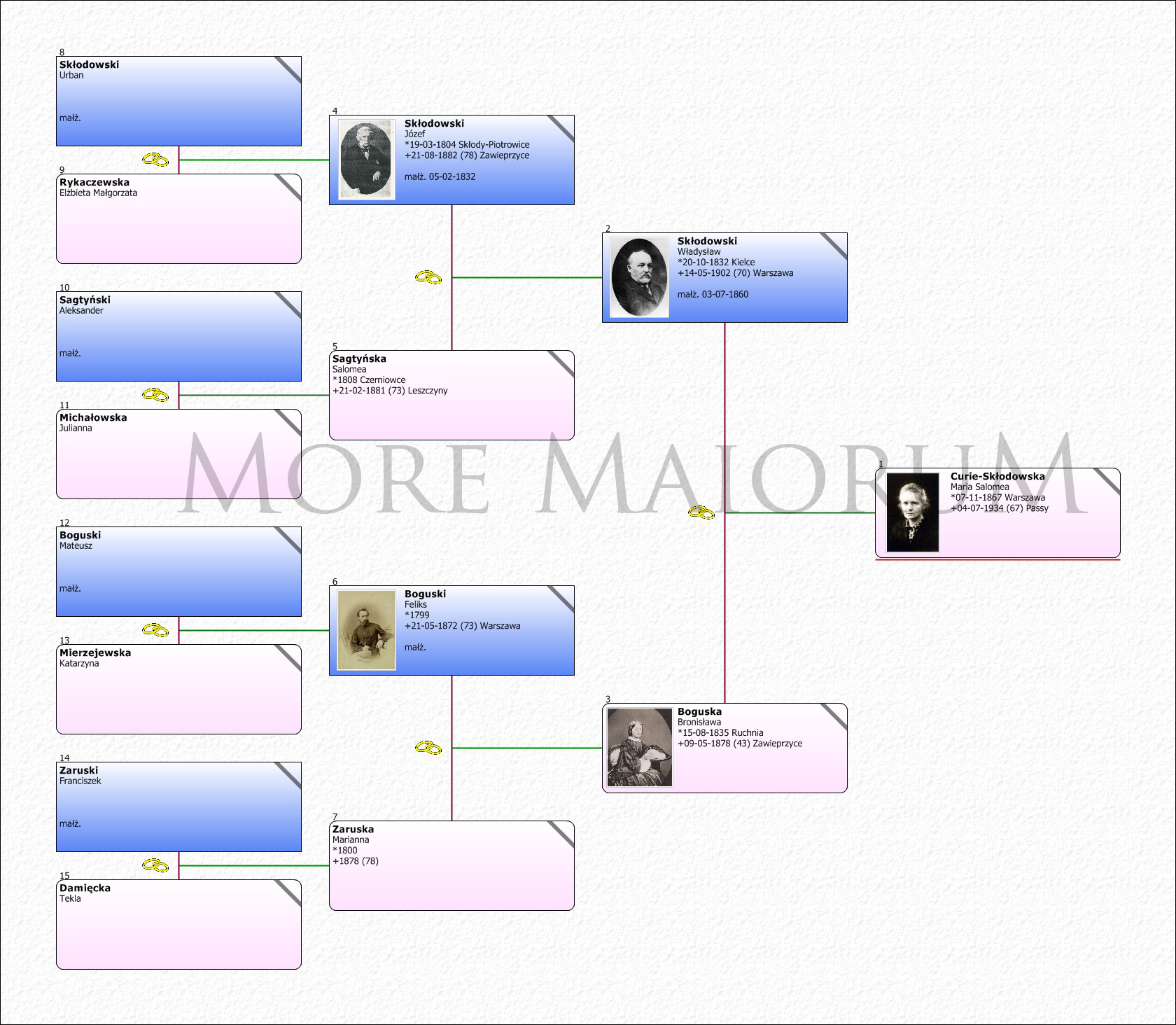Drugi dziadek polskiej noblistki – Feliks Boguski zmarł w Warszawie dnia 21 maja 1872 r. Według aktu był synem Mateusza Boguskiego i Katarzyny z Mierzejewskich. Pozostawił po sobie żonę Mariannę z Zaruskich. Feliks Boguski za wsi Jarnuty koło Śniadowa pod nieobecność komisarza zarządzał majątkiem składającym się z Czerwina, Grodziska, Styląg, Zaorza, Aksamitów i Trojan . Boguscy herbu Topór pochodzili z Mazowsza, Wywodzili się z Boguszyc, niedaleko Łomży, leżących w gminie i parafii Szczepankowskiej Jego żona Maria(nna), pochodziła z Zaruskich, również niezamożnej szlachty .