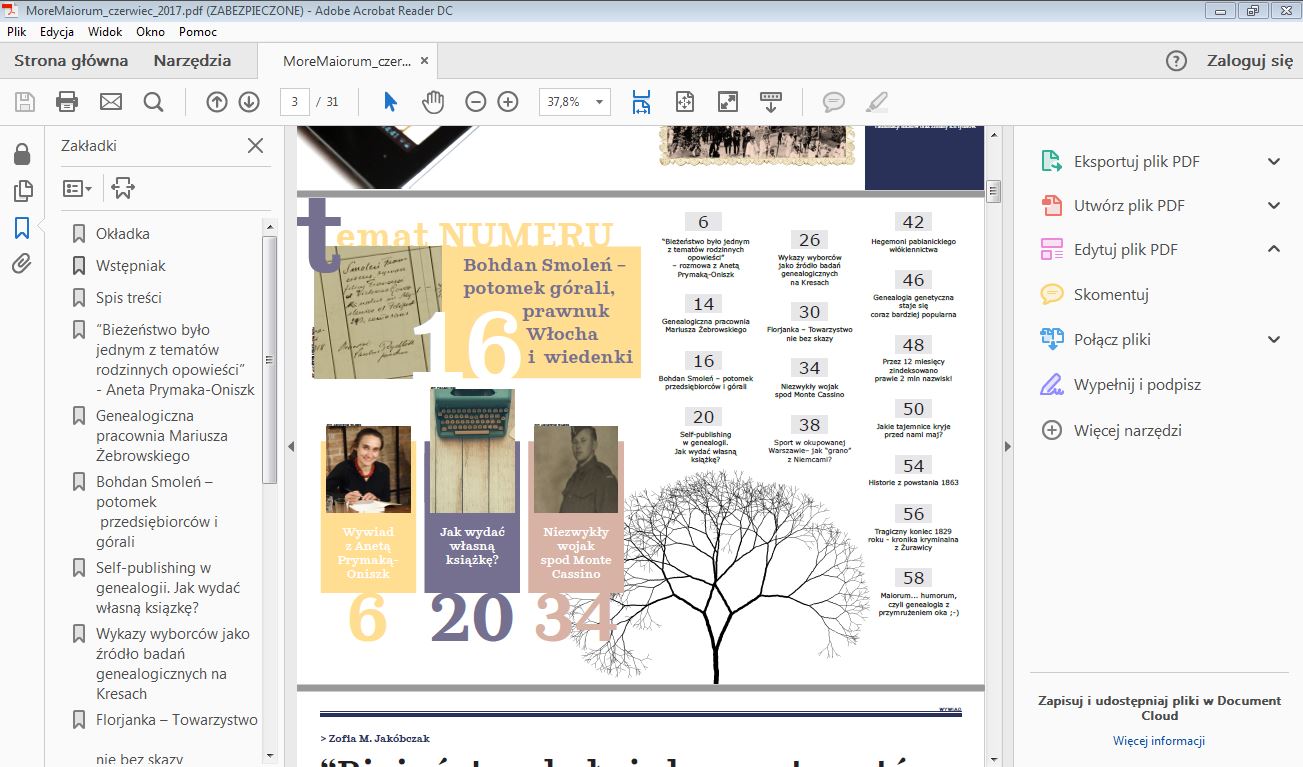 UWAGA! Od styczniowego numeru, otwierając „More Maiorum” w Adobe Acrobat (podstawowy program do obsługi plików PDF), po lewej stronie można otworzyć okienko „Zakładki”. Dzięki temu będziecie mogli swobodnie przechodzić między artykułami. Wystarczy kliknąć na tytuł: