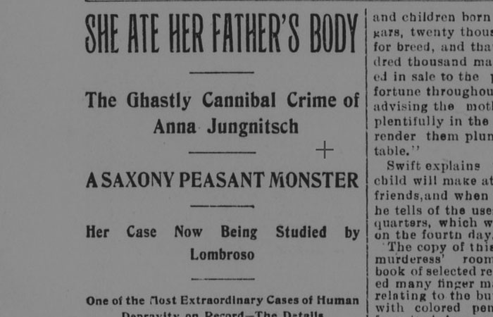 W 1895 r., w niewielkiej wsi Langwaltersdorf (ob. Unisław Śląski), mieszczącej się między Wałbrzychem a Mieroszowem, Anna Jungnitsch zabiła swojego ojca, a następnie przygotowała z niego „marynowaną wieprzowinę”. Swymi wyrobami chciała nawet poczęstować policjantów…
